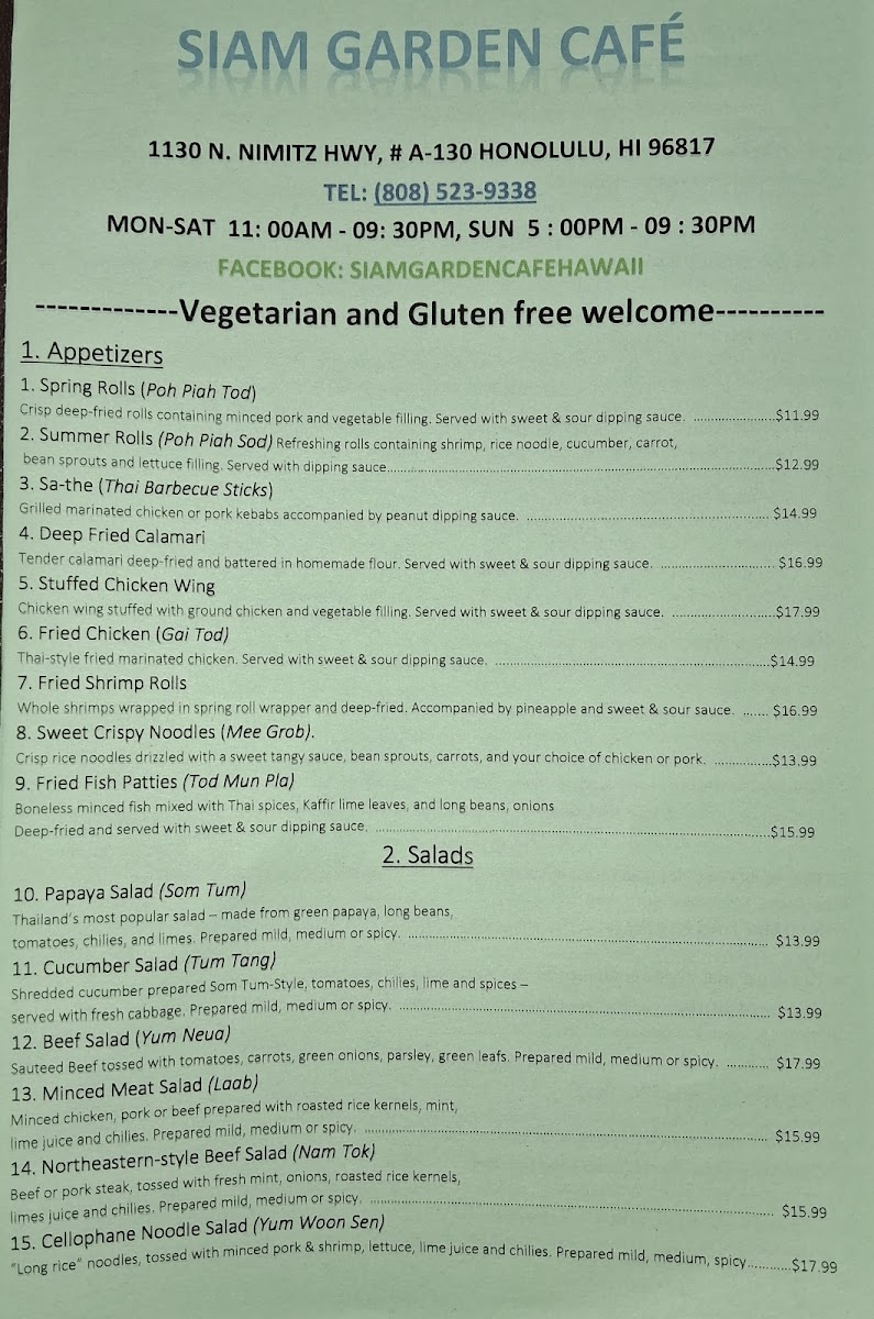 Nestled in the bustling heart of Honolulu at 1130 N Nimitz Hwy, Siam Garden Cafe is a culinary gem that invites you to embark on an unforgettable journey to Thailand without ever needing your passport. This delightful Thai restaurant combines vibrant flavors, refreshing ingredients, and a warm atmosphere, making it a must-visit for anyone craving authentic Thai fare.